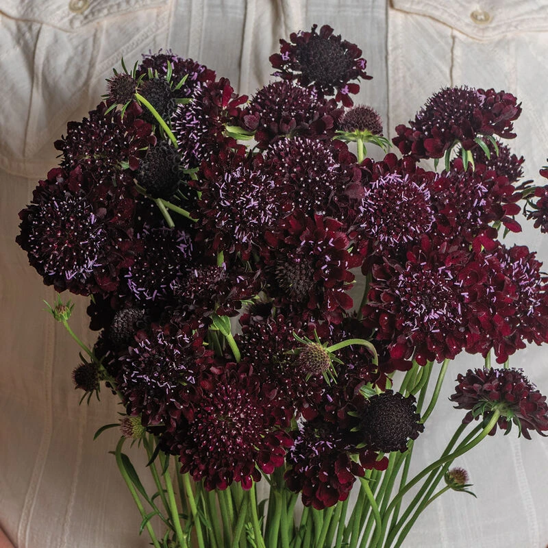 Almost black, 1 1/2–2 1/2″ blooms stand tall on strong, slender stems. Also known as mourningbride. USDA Certified Organic.