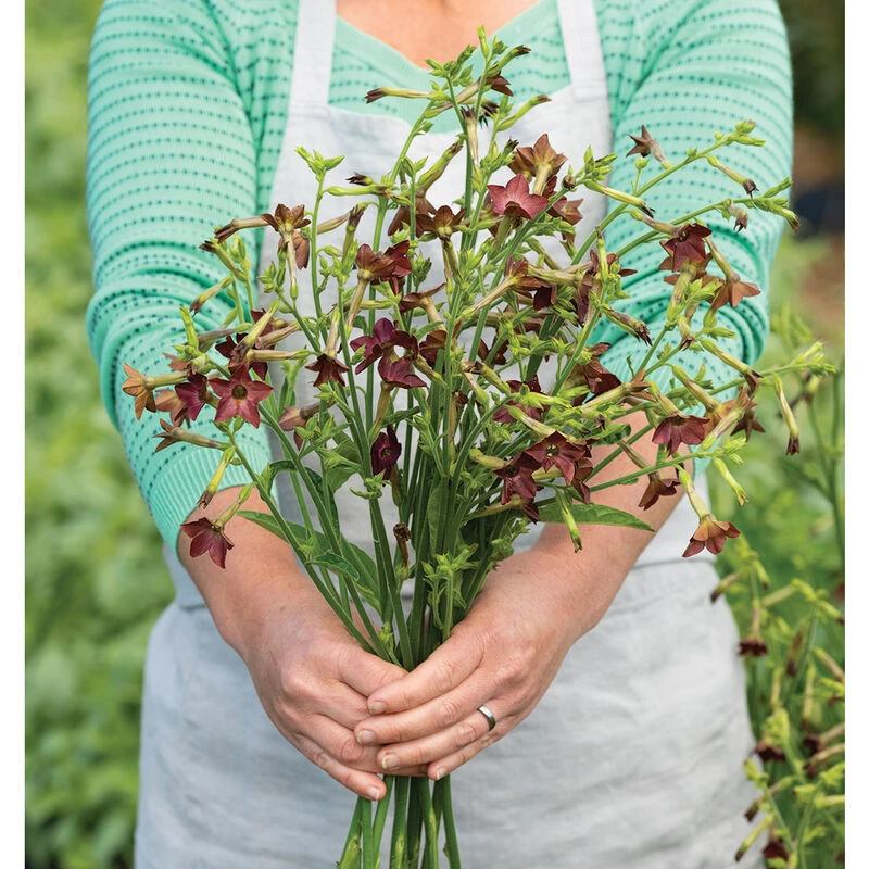 Bell-shaped, chocolate-purple blooms dance on contrasting bright green stems. Long stems add movement and interest to arrangements. Nicotiana flowers continuously for most of the season when cut back regularly. Blooms are relatively fragile and have a short vase life (5–7 days), making them best for casual bouquets, design work (not requiring a long vase life) and home cutting gardens. A favorite of pollinators and hummingbirds. Also known as flowering tobacco.