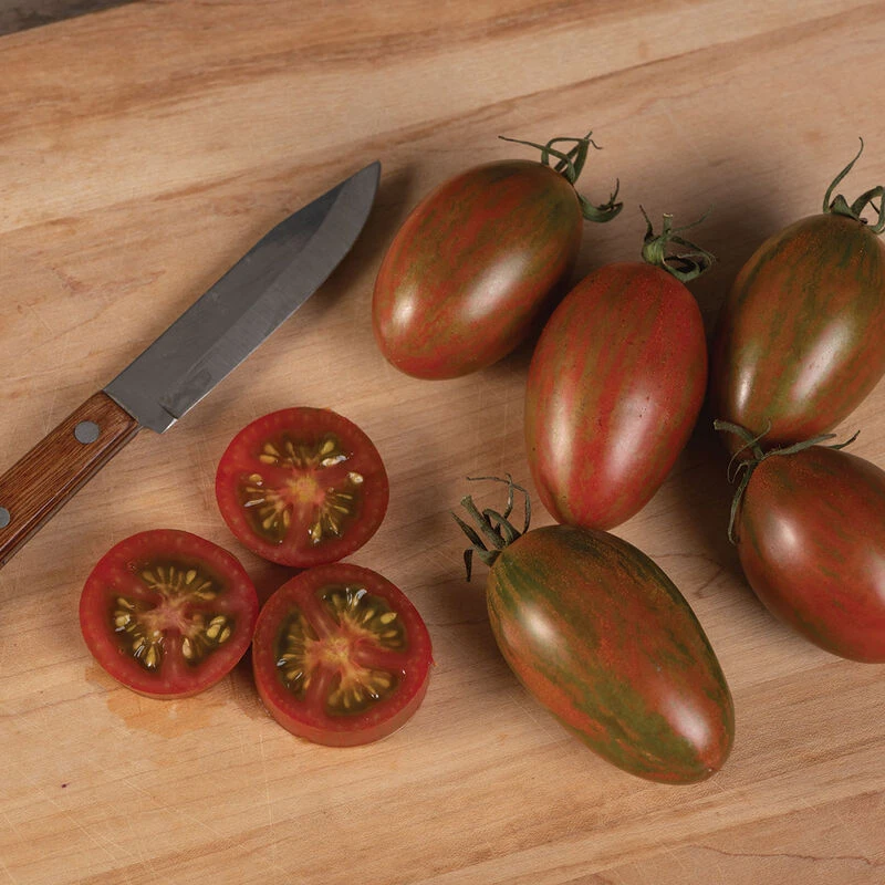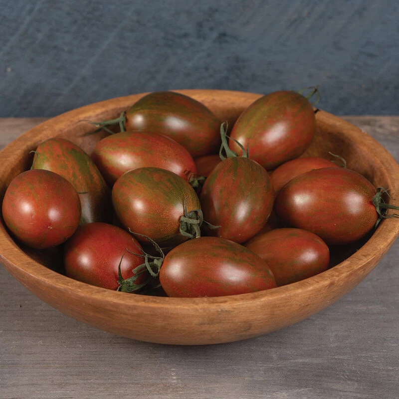 A delicious, small saladette in the Juliet size class. Fruits avg. 1 1/2 oz. and are a beautiful shade of brick red with bronze stripes. This prolific early producer is crack-resistant and performs well even under heavy disease pressure. A dramatic offering at market and a great addition to specialty mixes. Earlier and more productive than Pink Tiger. Indeterminate.