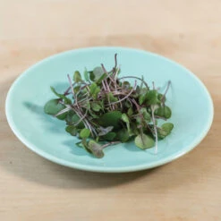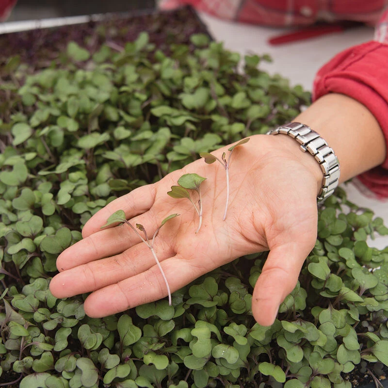 Mild brassica flavor with a touch of heat. Based on our yield trial, we recommend seeding 10.5 gm per tray at approx. 3 flats per oz of seed. Avg. days to maturity was 13.5 days when harvested at the first true leaf (as opposed to cotyledon) stage. Also available in organic seed.