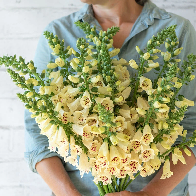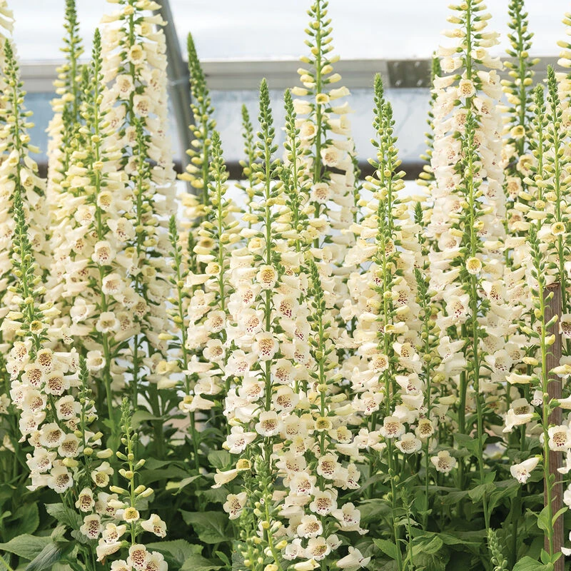 Ivory and cream bells with dark red freckling in the throat: a dramatic and elegant color combination. Bells circle the stem. Plants produce 1–2 large, full, center spikes. High-quality side shoots make abundant cut flowers and fill out the plants in garden beds. Great for bouquets and gardens. Best when treated as a fall or spring-planted hardy annual, as winter survival is generally poor when treated as a perennial. Pelleted seeds.