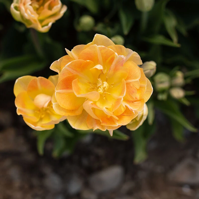 2 1/2–3″ double blooms open in shades of soft yellow and peach-apricot. As blooms mature, the peach-apricot color deepens. Most plants produce multiple buds, often developing more than one bloom per stem. Lightly fragrant. Pairs nicely with Finola and Crème Upstar. NOTE: Bulbs do not come pre-chilled; if growing in hardiness Zones 8–10, see growing information (below) for pre-chilling instructions.