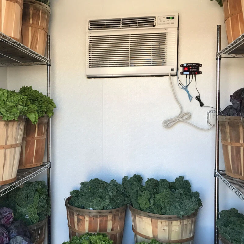 Transform an insulated room into a walk-in cooler to keep your vegetables, meat, flowers, and other products fresh and thermostatically controlled down to 34°F. Not only helps you save on installation and repair costs, but also electricity, reducing your operating costs. Easy to install and maintain. Performance varies based on room size and size of A/C unit. Specific air conditioner models recommended; see product insert for details. NOTE: The CoolBot is now the same controller as the CoolBot Pro (minus the jumper and cables which allow for WiFi connectivity) and will show the words “CoolBot Pro” on the unit. This change allows you to easily upgrade to the CoolBot Pro in the future. For the CoolBot® Pro (WiFi enabled) see part #7867.