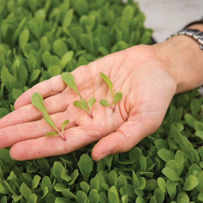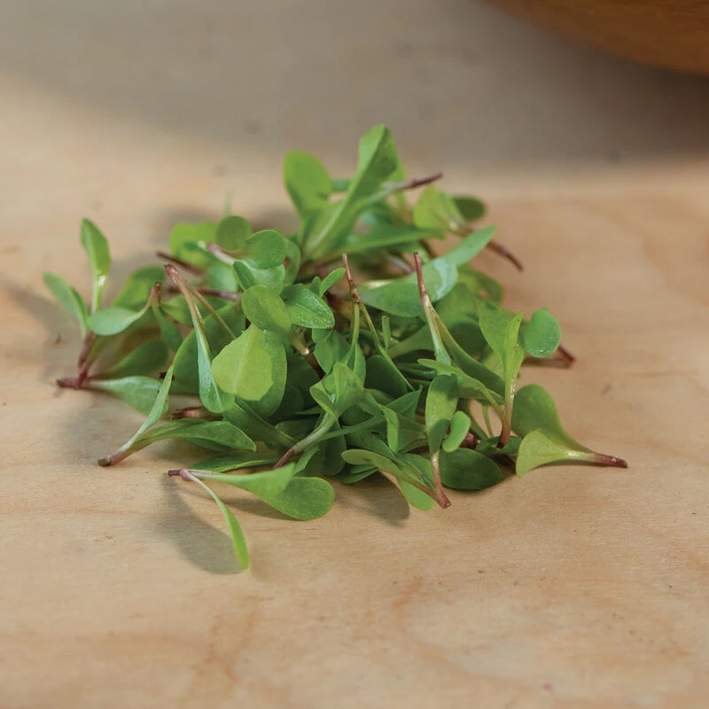 Mildly bitter flavor. Based on our yield trial, we recommend seeding 4 gm per tray at approx. 7 flats per oz of seed. Avg. days to maturity was 18 days when harvested at the first true leaf (as opposed to cotyledon) stage.