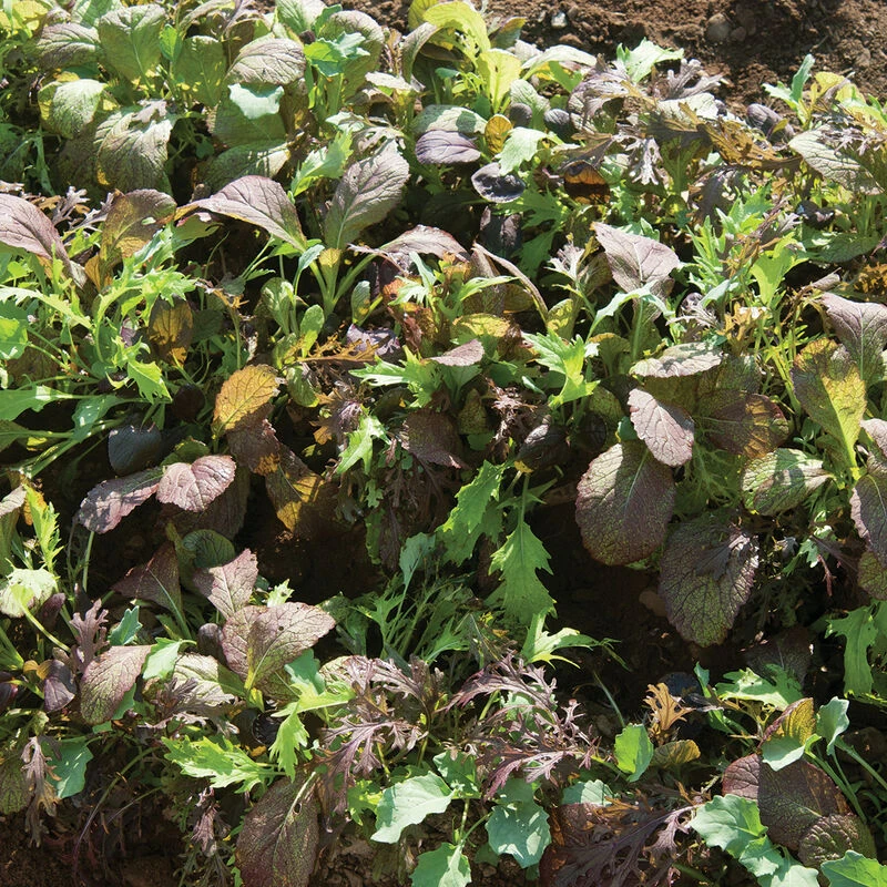 Colors range from dark- and bronze-red to shades of green. The combination of flavors and textures makes this a beautiful salad. This mix includes pac choi, red mustard, and mizuna. Varieties are subject to change depending upon availability.
