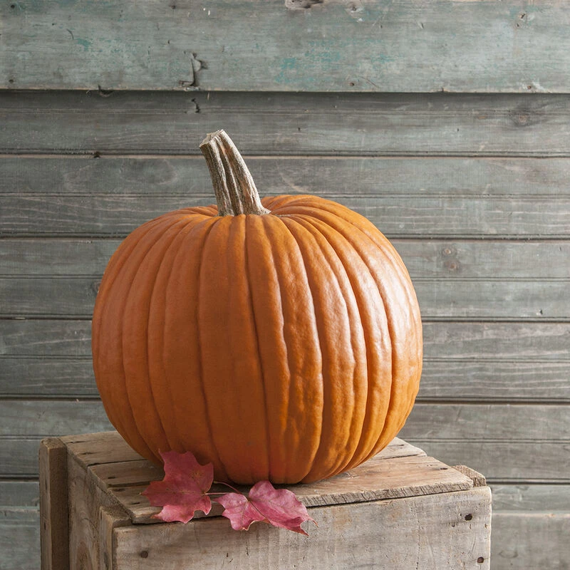Blocky, upright, medium-large jack with deep orange color and big, dark green handles. It’s easy to like the appearance and yield of this big pumpkin. Long vine. Avg. 22–30 lb. Also available treated, 250 seeds and larger.