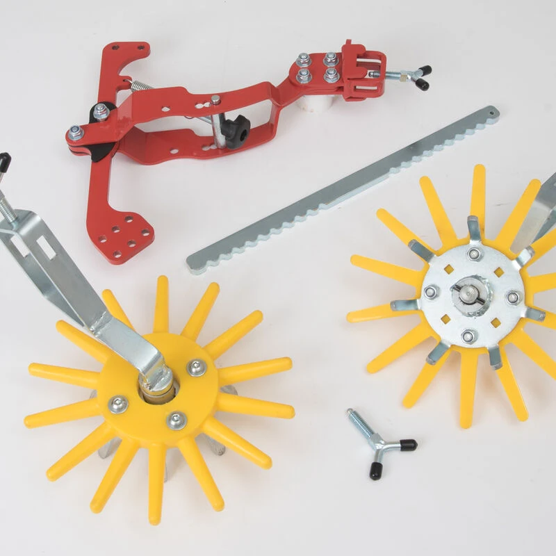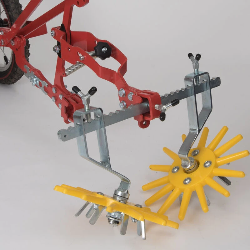 Each assembly has steel traction fingers and 9.5″ polyurethane finger discs on a support shank. Angled in, Finger Weeders turn together, gently agitating the soil near the crop and uprooting thread-stage weeds. For use on many established crops, including brassicas, lettuce, and especially carrots. For greatest efficiency, use in conjunction with other attachments, such as Preci-Discs, for concurrent in-row and inter-row weeding. Includes spring-loaded mounting arm, 16″ toolbar, two Y-bolts, and two finger weeders with upright brackets. Stiff fingers. For standard (medium) soils. Yellow. Made in France by Terrateck. NOTE: For use with the Terrateck Double Wheel Hoe only. Also available in a model designed for soft or sandy soil.