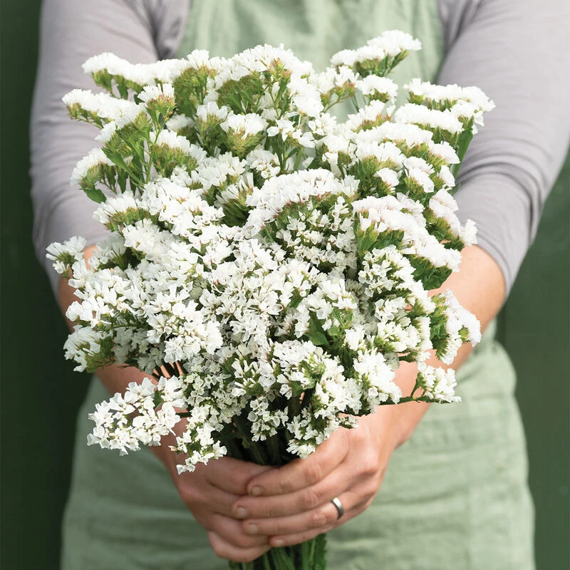 Plants are slightly taller than Seeker White; otherwise, Forever Silver is very similar in overall performance. 1 1/2–3″ flower clusters are produced on strong stems in the field and greenhouse. Blooms are pure white, with some showing a slight blush of pink. Also known as annual statice and wavyleaf sea lavender.