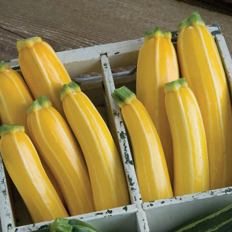 Spineless, easy-to-harvest plant is a high-yielder of attractive, shiny yellow cylindrical fruits with white stripes and fresh-looking, green stems. Makes a beautiful display mixed with Safari.
