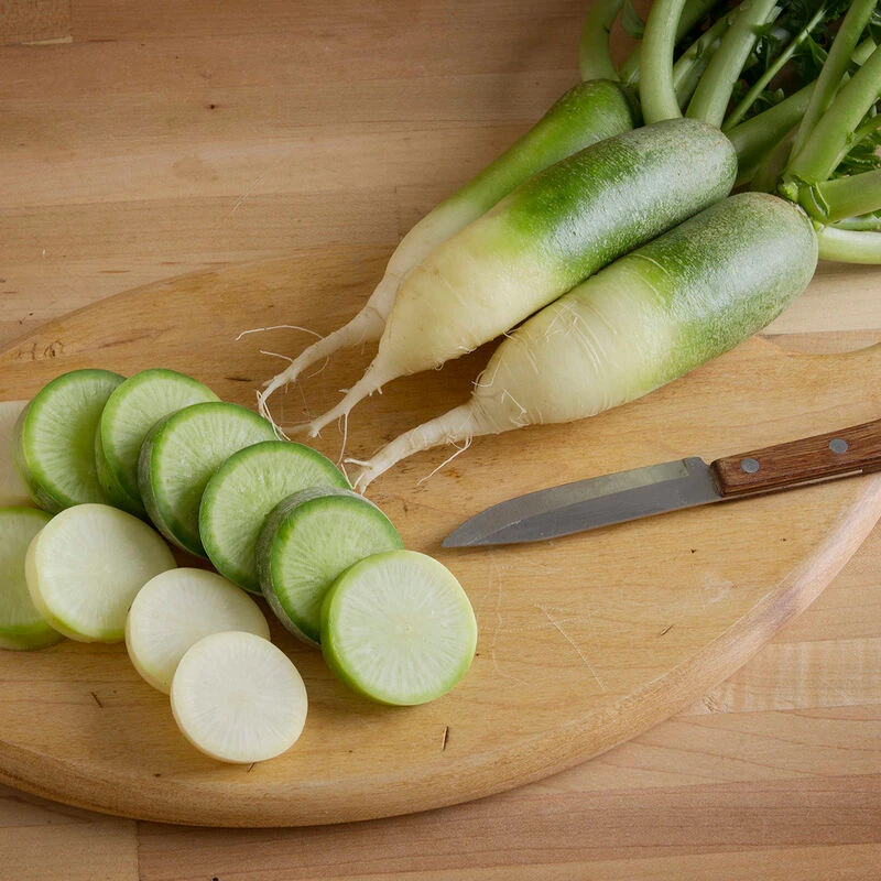 Adds beautiful green color to kimchi. Also great for fresh eating. Uniform and fast-maturing. Selected for its flavor profile: a nice balance of sweet and spicy. Roots avg. 5–7″ long. Vigorous, dark green tops are spineless for itch-free harvesting. Replaced Green Meat. For summer planting/fall harvest. For long storage. NOTE: Not recommended for spring sowing, as it is prone to bolting.