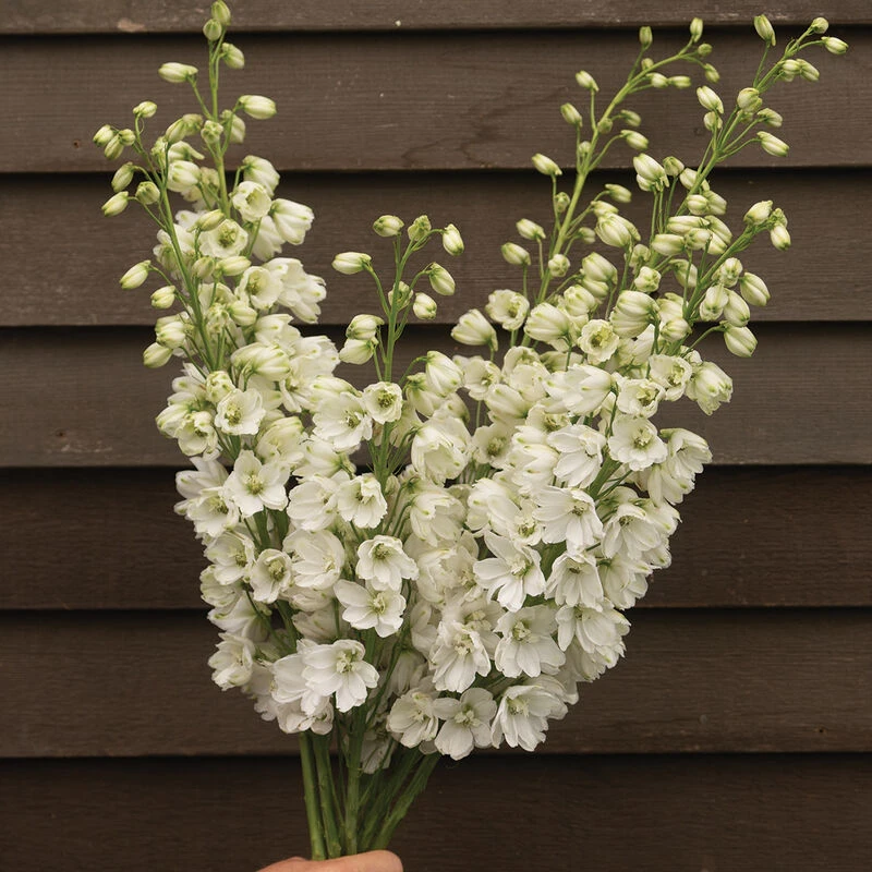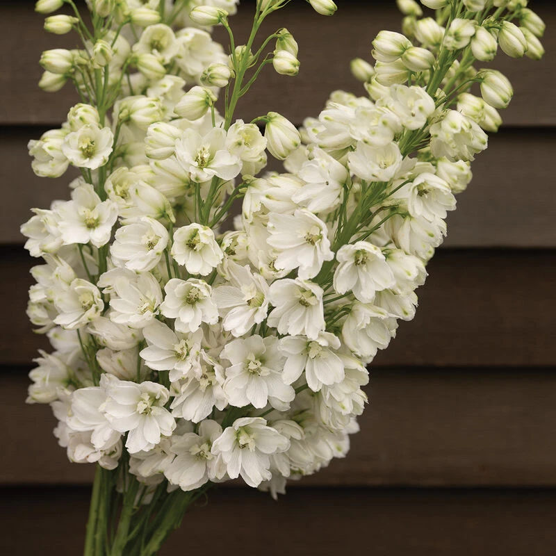 Uniform flowering time and plant height allows for efficient harvesting. The Guardian Series is bred to perform well under short days for greenhouse production. Guardian also performs well in our field trials, blooming under long days. Vigorous plants with excellent bloom and stem quality for cut flowers. Also suitable for garden beds and landscaping. Compared to Magic Fountains Pure White, bloom color has a touch more ivory and green as the buds open. Attracts bees and butterflies. This species of delphinium is also known as candle larkspur. Perennial in Zones 3–7.