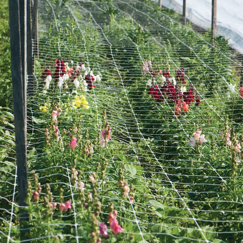 Horizontal trellis for supporting long stems in cut flower cultivation.