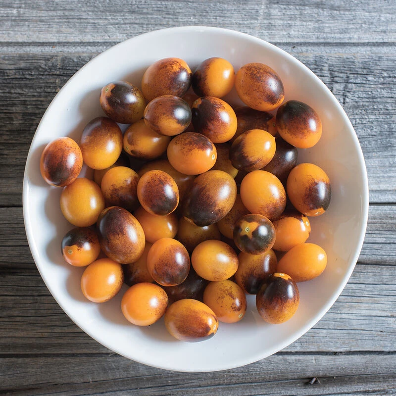 High-yielding plants produce 15–20 gm. orange fruits with dark indigo-colored shoulders. Very sweet flavor with a surprising, tart kick of acidity. Compact indeterminate plant requires minimal pruning and yields well, even in unfavorable conditions. Stunning combined in mixed quarts with Indigo Cherry Drops or with other grape or cherry varieties, but unique enough to offer alone and brand by name. Harvest when background color fills in uniformly orange and fruits begin to soften. Indigo color is derived from anthocyanin, a known antioxidant.