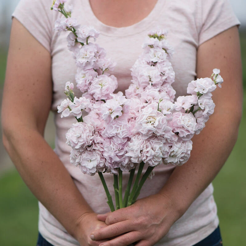 Early single-stem, or column-type stock in a highly uniform series for one-cut harvest. Aptly named for strong, straight, rigid stems. Iron performed well in our spring, early summer, and fall trials. Selectable for doubles and 55% double without selection. Compared to Katz, Iron is slightly later to flower, and has somewhat shorter and thicker stems. Tightly spaced florets on the flower spike make for compact 1 1/2–2″, soft blush/rose pink blooms with a full appearance. NOTE: This variety produces one flowering stem per plant. Pinching is not advisable as it will terminate flowering.