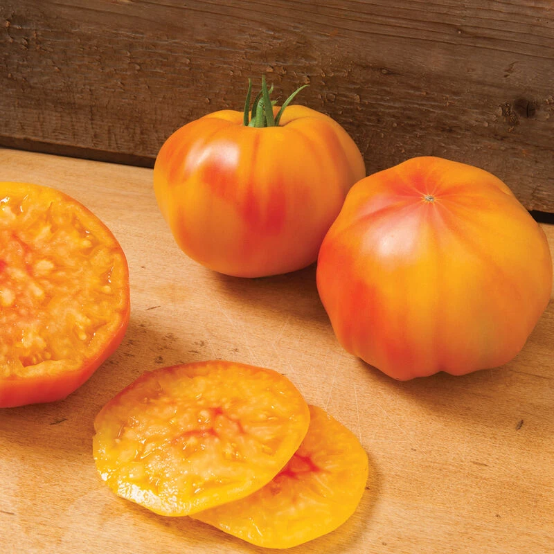 Margold preserves the look and flavor of the red-streaked yellow heirlooms like Striped German, while improving upon resistance to disease and fruit defects. Very soft flesh has excellent, sweet flavor and meaty texture. Works well following Ginfiz, with more vigorous plants for a sustained harvest. Leaf mold resistance is an added benefit for indoor growers. 7–10 oz. fruit. NOTE: Margold requires a minimum of 13 hours of daylight, starting at emergence. This light requirement can be achieved using artificial, supplemental lighting. To determine when day length reaches 13 hours in your area, you can use a daylight calculator. Indeterminate.
