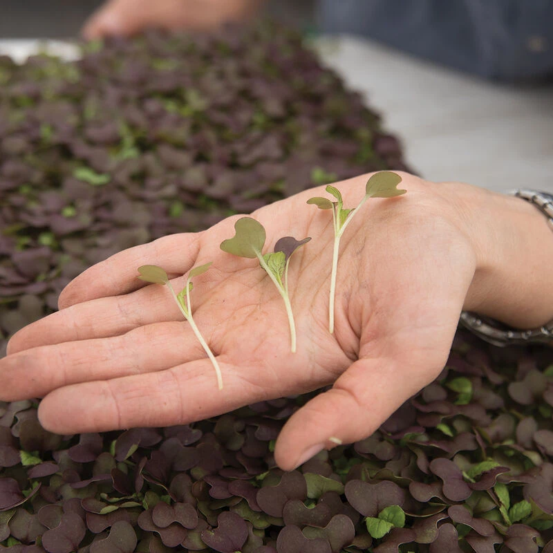 Dark purple cotyledons (first leaves) provide beautiful contrast to the green true leaves, which are splashed with purple and have slightly toothy margins. Based on our yield trial, we recommend seeding 8 gm per tray at approx. 3.5 flats per oz of seed. Avg. days to maturity was 12.5 days when harvested at the first true leaf (as opposed to cotyledon) stage.