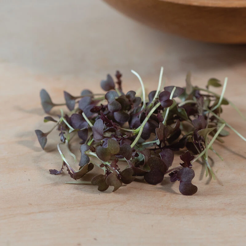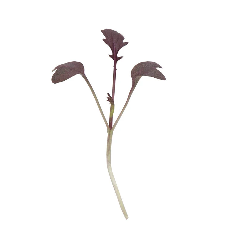 Slightly lobed, dark purple true leaves, dark purple cotyledons (first leaves), and light green or pink stems. Based on our yield trial, we recommend seeding 9.5 gm per tray at approx. 3 flats per oz of seed. Avg. days to maturity was 14.5 days when harvested at the first true leaf (as opposed to cotyledon) stage. NOTE: Miz America is sometimes considered or classified as mizuna, as it is a mustard/mizuna cross.