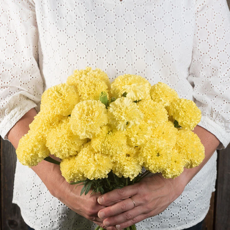 A good choice for those who dislike the classic marigold fragrance, as the 2–3″ blooms produce little to no scent. Deep green centers lighten to lemon-yellow as blooms mature. Dark green foliage. NOTE: Light-colored marigolds such as Nosento seem to be more attractive to Japanese beetles which feed on petals and foliage, causing damage.