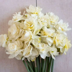 3″ light creamy-white double blooms. Produces one flower per stem. Blooms mid-May in our outdoor trials.