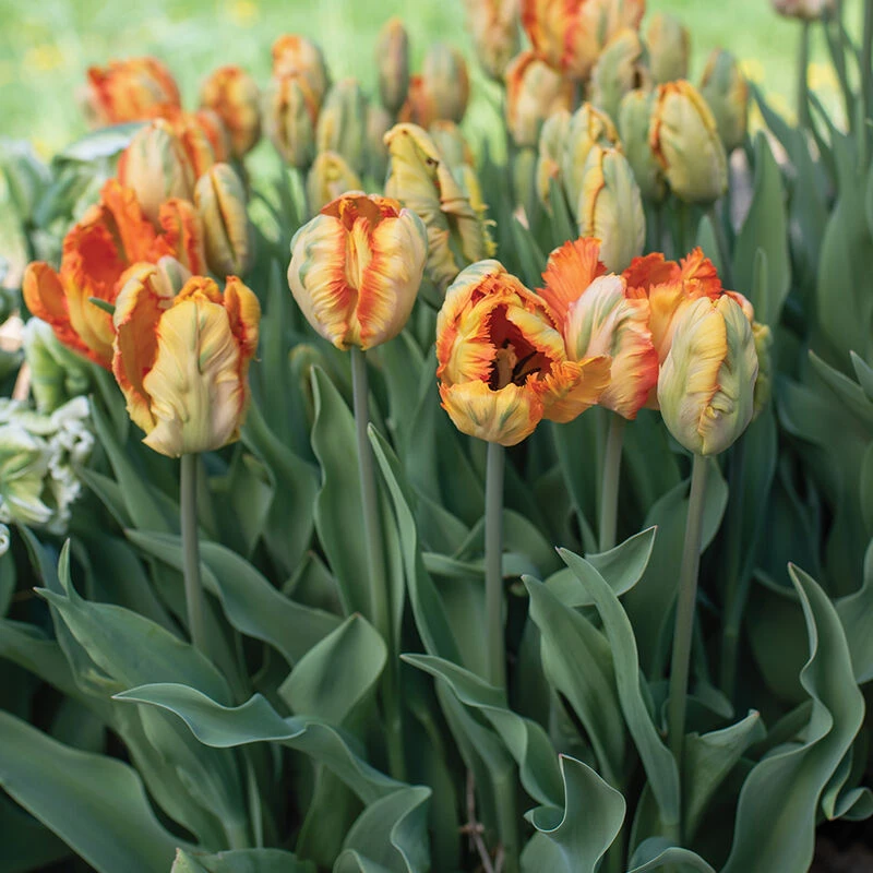 3–3 1/2″ blooms with striking colors and intricate patterning. Petals in apricot and orange hues with gold, green, and cream shades that appear painted on in delicate detail. Feathery petals are nicely scalloped and crimped. NOTE: Bulbs do not come pre-chilled; if growing in hardiness Zones 8–10, see growing information (below) for pre-chilling instructions.