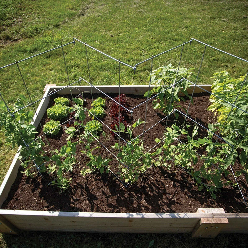 Heavy-duty galvanized wire fencing can be zig-zagged for optimal support of peas and other vining crops. Plants remain upright for easy harvesting. 5-panel design with 10 legs for sure support. Collapsible for easy storage. Made in the USA. 72″ L x 40″ H. Overall height: 48″. Wire gauge: 12 (.1040″). Quantity: 2 fences.