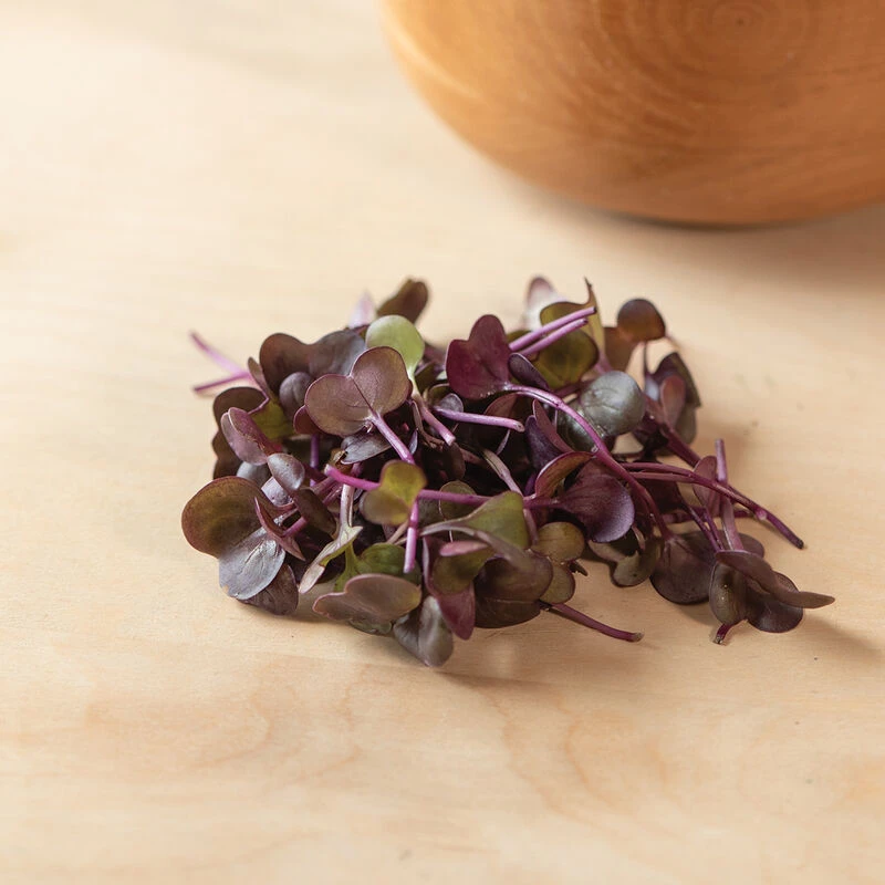 One of our fastest-growing microgreens! Improved dark purple variety with a very rich color and a lower percentage of green plants. Flavor is mildly spicy, not harsh. Micro radish leaves add flavor, visual appeal, and bulk to mixes. Based on our yield trial, we recommend seeding 24.5 gm per tray at approx. 1 flat per oz of seed. Avg. days to maturity was 10 days when harvested at the first true leaf (as opposed to cotyledon) stage. USDA Certified Organic.