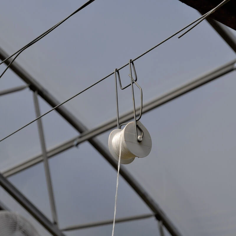 Heavy-duty galvanized hook holds a 100′ (30 m) spool of UV-resistant polypropylene twine. Easily release twine while sliding down trellis wire to lower-and-lean tomatoes, eggplant, cucumbers, and more. Suitable for use with trellis wire with diameters between 2.5–5 mm (#10–#4 gauge). Can be used for up to 3 seasons with proper care. Rated to hold up to 22 lb. Twine tensile strength 66 lb. Assembled. 1 Unit = pack of 25. Replacement spools available.
