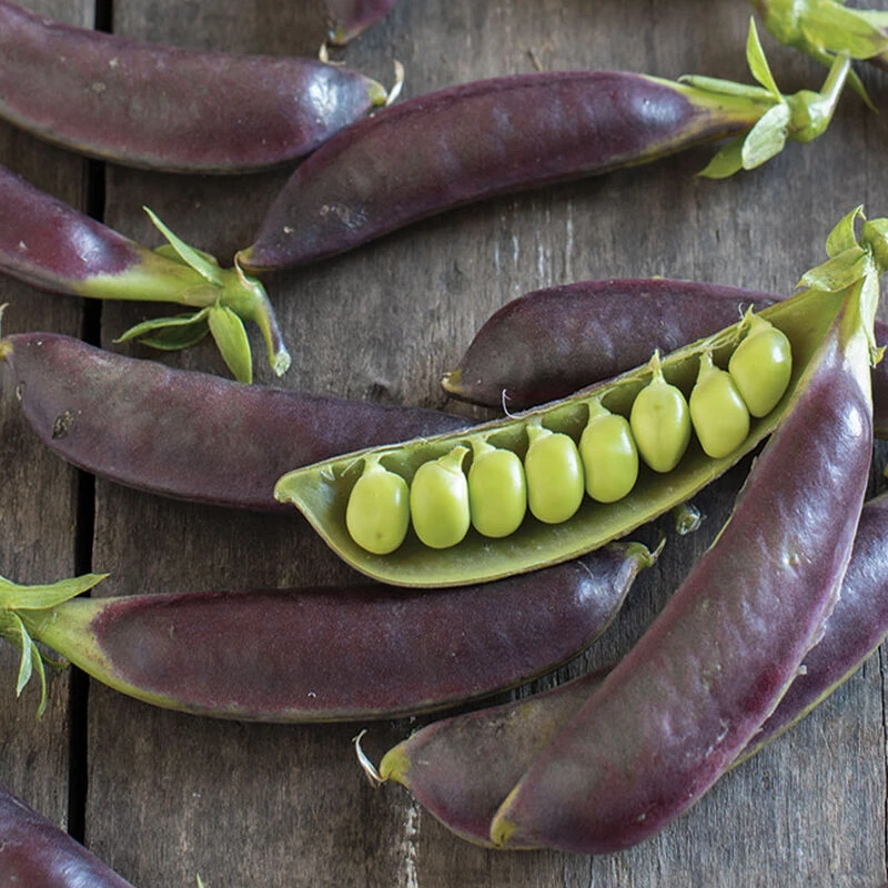 This gorgeous purple snap pea comes to us from the late Dr. Calvin Lamborn, the father of the snap pea and breeder of the classic Sugar Snap. Looks great combined with its counterpart, Honey Snap II, and either Sugar Ann or Sugar Snap. Remove string from pods before cooking. Pods avg. 2 3/4–3″ long with 2 per node on 24″ vines.