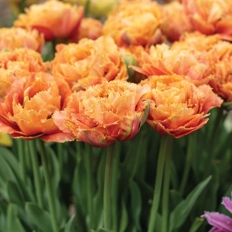 Immense 3–4″ bowl-shaped blooms — among the most “fully double” varieties we’ve seen in our tulip trials. Countless layers of petals in shades of apricot, rosy pink, and green which transition to a glowing peachy gold as the blooms mature. Delicately fringed petals. Very uniform in height and bloom size. Lightly fragrant. Sturdy stems. NOTE: Bulbs do not come pre-chilled; if growing in hardiness Zones 8–10, see growing information (below) for pre-chilling instructions.