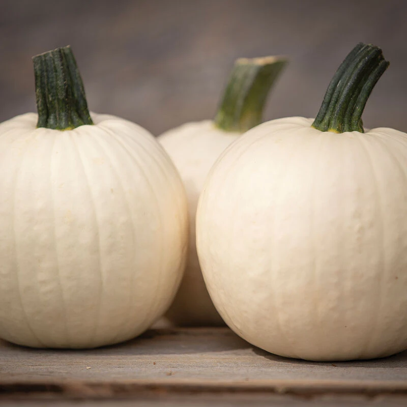 Gleaming white, tabletop pumpkin with strong green handles that won’t snap off. Cute blocky shape. Avg. weight: 1 1/2–2 1/2 lb. Compact habit allows for tighter spacing and higher yields. Holds its color well. Bred by the late Dr. Brent Loy of UNH.