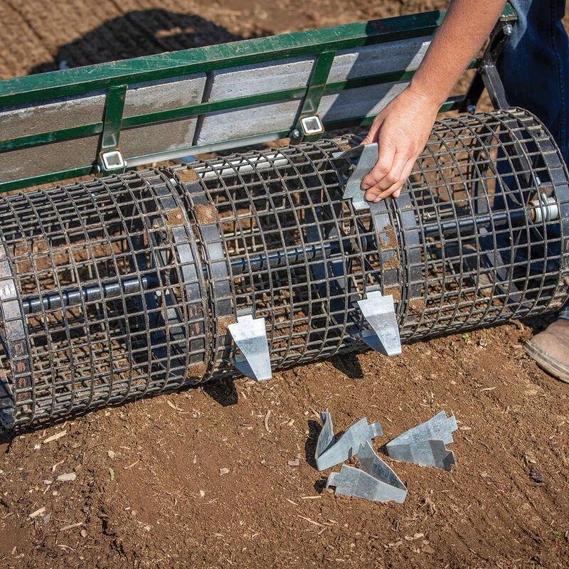 Available in three sizes and easily interchangeable, allowing many combinations of plant spacings. Makes up to 1.5″ transplanting holes. The seedbed roller’s 1″ mesh and 36″ circumference make dibble arrangement simple and intuitive. No special tools required; just squeeze, and they snap right in, securely gripping the coated trap wire mesh from both inside and out. Change-out for new setups is fast and easy. They work as well through plastic mulch as they do in open soil (sometimes better due to moisture level). Made from galvanized plate steel for corrosion resistance (some edge rust is normal). Made in USA. NOTES: 1.) Always pull roller when using dibbles. 2.) Additional weight is needed to achieve correct dibble spacing and to penetrate plastic mulch.