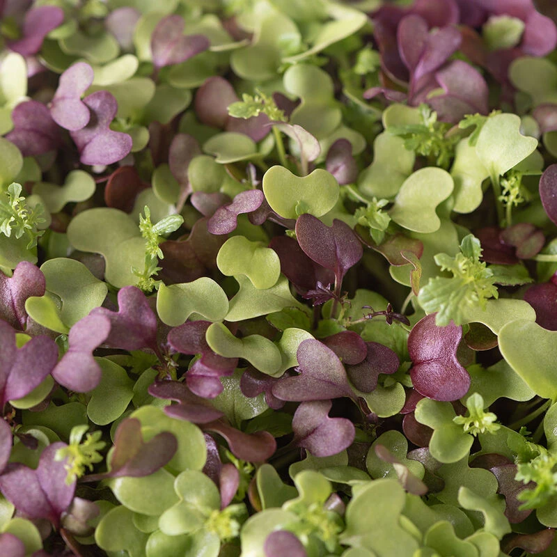 A colorful blend of red and green mustards with various textures. Spicy flavor pairs well with the Mild Micro Mix. Based on our yield trial, we recommend seeding 7.5 gm per tray at approx. 3.5 flats per oz of seed. Avg. days to maturity was 13.5 days when harvested at the first true leaf (as opposed to cotyledon) stage. Varieties are subject to change depending upon availability.