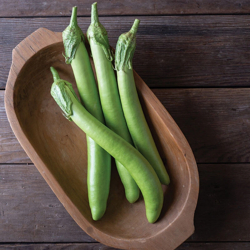 Lives up to its reputation as one of the best-tasting eggplants—firm texture, few seeds, sweet and tasty flesh—perfect for broiling or grilling. Thin-skinned and never bitter. Cooks very quickly. Lime-green skin is colorful at market.