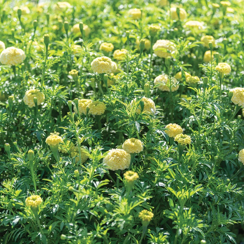 2–3″ cream to pale yellow-colored, fully double, uniform blooms borne on productive, sturdy, uniform plants. High-quality blooms produce a mild, sweet, marshmallow fragrance, without the typical strong marigold scent. More compact plants than those from the Giant and Coco™ Series. White Swan is significantly taller and higher quality than all other cream-colored marigolds in our trials. Also known as African marigold, American marigold, and Aztec marigold.