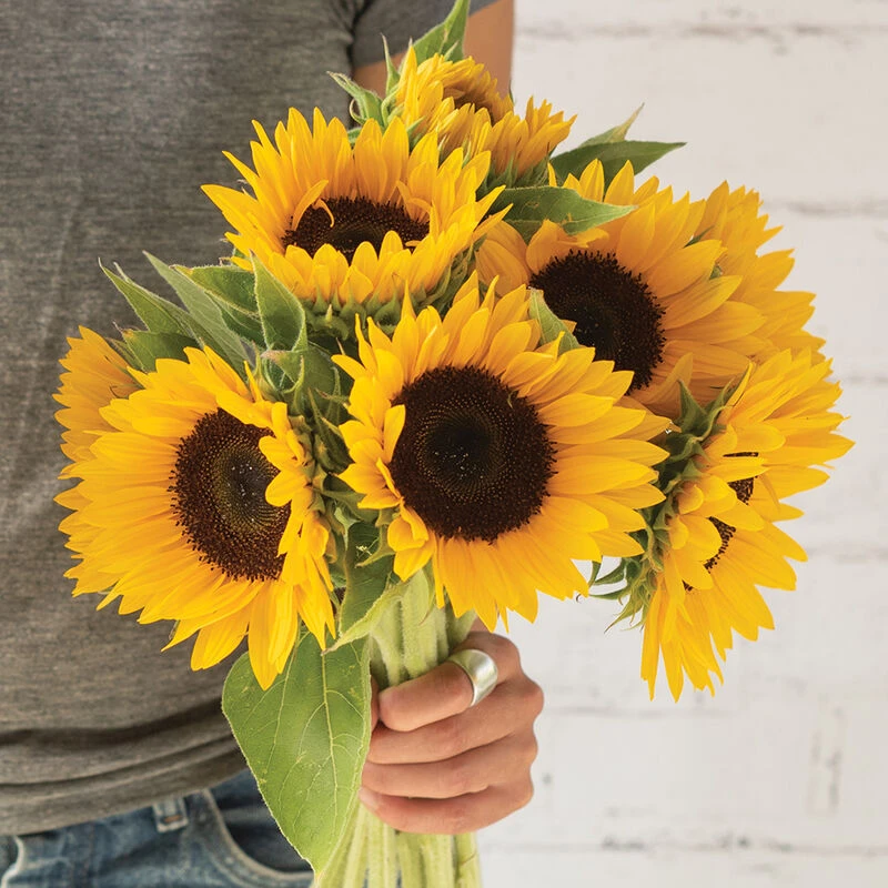 Tall, uniform plants with 5–7″ wide blooms. Classic sunflower look. Long, slender orange rays surround a dark disk. Best for counter-seasonal fall and winter production in the south. Pollenless. Single stem. USDA Certified Organic.